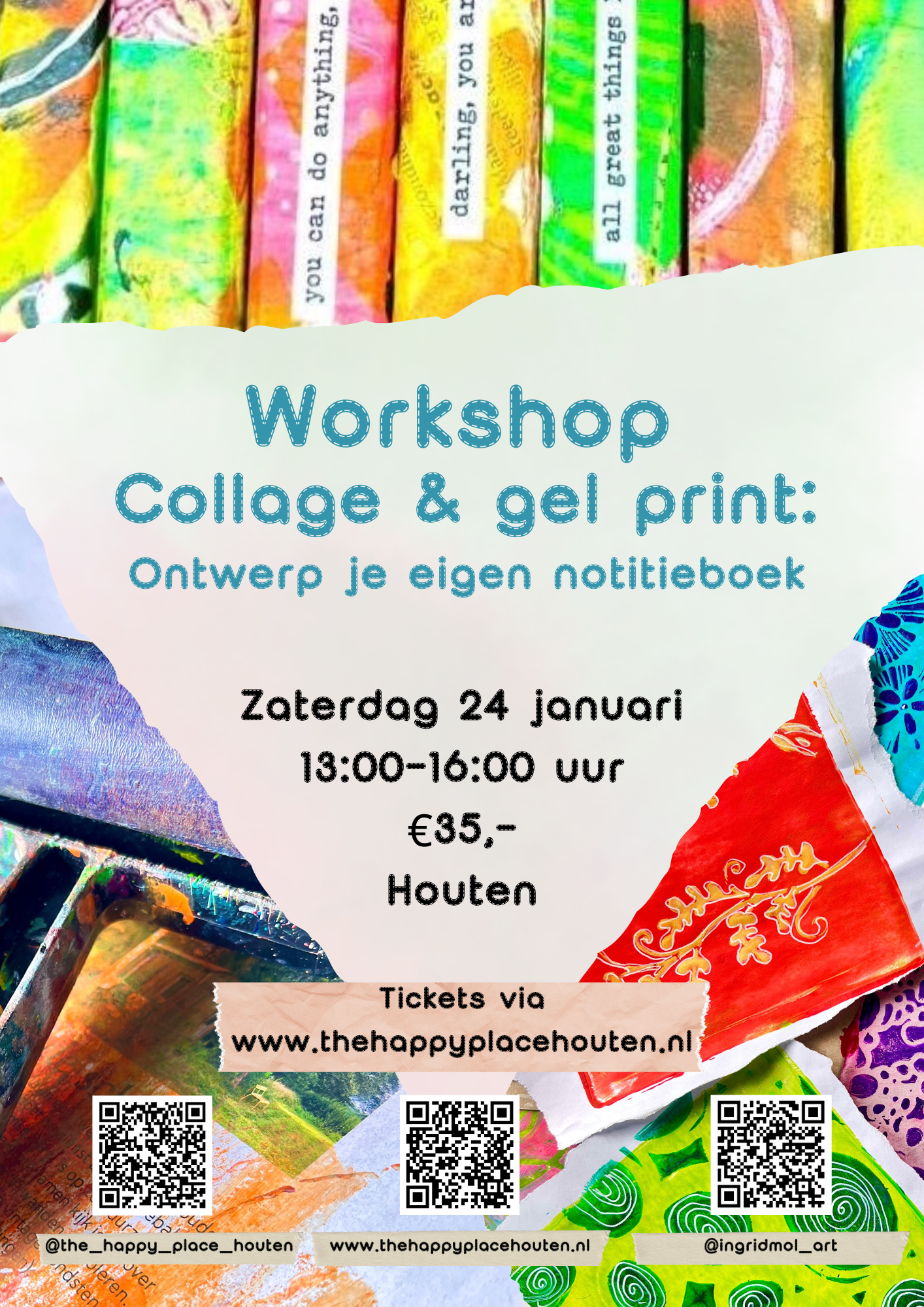 Onder professionele begeleiding van Ingrid Mol ga je aan de slag met gelli platen, papieren, structuren, acrylverf, rollers, stencils, stempels etc.